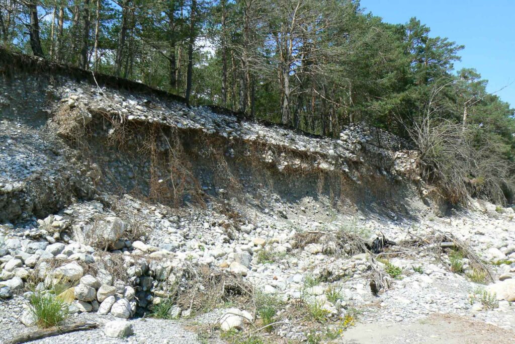 Autre effet boule de neige de ce calme hydrologique, c’est le développement d’une végétation mature dans le lit du cours d’eau. En temps normal, une rivière en tresses a un fonctionnement dynamique qui s’explique par la succession des crues et un apport plus ou moins régulier en matériaux depuis les versants : au gré des crues, à un endroit donné de son cours, elle va tantôt déposer des matériaux, tantôt les remobiliser, son altitude varie autour d’une altitude moyenne dite à l’équilibre ; les chenaux sont nombreux et mobiles (ils se déplacent à gauche, puis à droite, puis au centre, puis encore à droite, etc. au gré des crues).