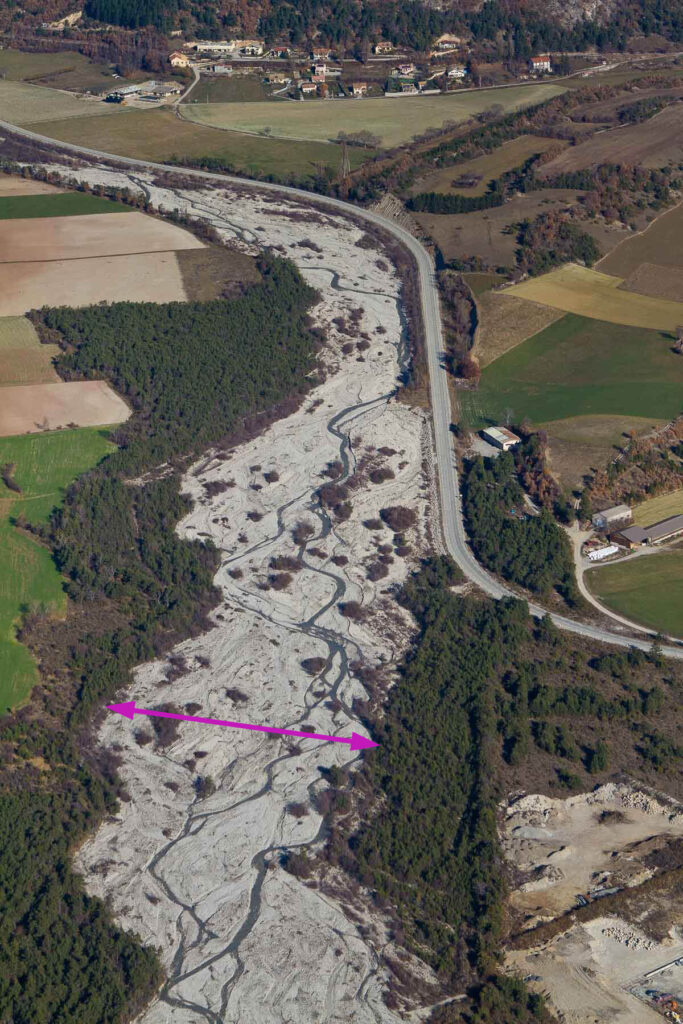 Cette dynamique fait que la rivière conserve sa largeur, la végétation qui colonise le lit est régulièrement emportée et rajeunit. Mais que ce moteur se grippe, soit moins de crues fortes et fréquentes et moins d’apport en matériaux, et la rivière, alors moins puissante et moins mobile, céderait le pas à la végétation, très opportuniste. De par ses racines, et sa maturité (si aucune crue ne les dessouche entre temps) elle piège les matériaux déjà peu nombreux pour un bon fonctionnement, fixe les berges et forme des ilots de végétation mature. Ce phénomène est observable dans les zones anciennement très large comme dans la plaine d’Aspremont ou à Lus-la-Croix-Haute (cf les deux images ci-dessous).