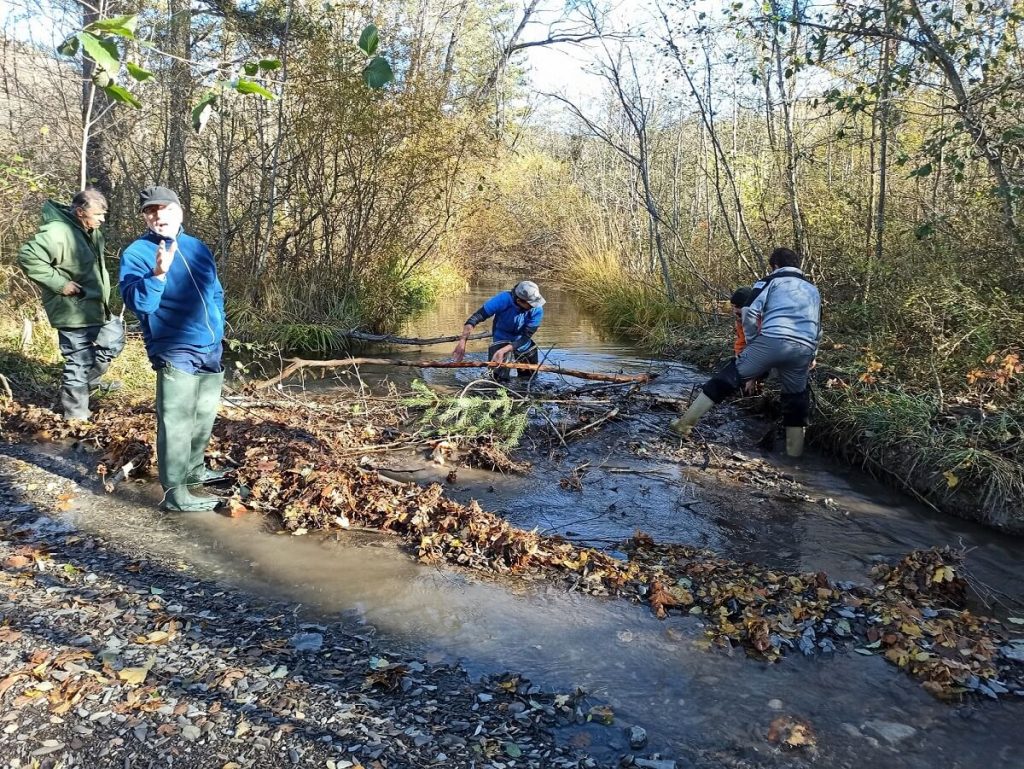 On remonte ainsi l’adoux et on repère le premier embâcle qui fait l’objet d’une remise à niveau. La progression vers l’amont continue, les embâcles sont traittout en laissant sur un coté la possibilité aux truites de remonter, 4 sont protégés de l’aval à l’amont. Il ne reste plus à l’équipe qu’à enlever le reste des embâcles, limitant la progression des truites aval/amont pour aller déposer leur fraie et attendre les 400 degrés jours pour l’éclosion.